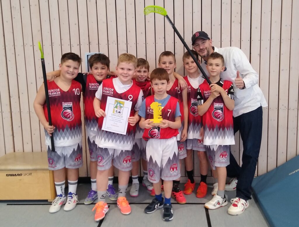Weitere InformationenAuch im Schuljahr 25/26 fand wieder das vom Arbeitskreis Sport veranstaltete Floorballturnier für die Grundschule 3/4 Klasse in Hirschaid statt. Dieses Turnier erfreut sich immer größerer Beliebtheit, sodass sich alleine für den Landkreis Bamberg 12 Teams angemeldet haben. Auf zwei Feldern wurden gleichzeitig die Begegnungen aus zwei Vorrundengruppen ausgespielt. In Gruppe 2 konnte sich unser Schulteam Pommersfelden ungeschlagen als Gruppensieger für das Finale qualifizieren. Dort trafen wir auf die Mannschaft aus Heiligenstadt. Nach Ende der torlosen Spielzeit musste das Spiel im Penaltyschießen entschieden werden. Hier war das Glück auf unserer Seite und wir konnten zum ersten Mal als Sieger des Turniers die Trophäe von Schulrätin Sandra Lichtenstein in Empfang nehmen.